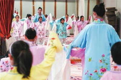 7月9日,在展示会上,教师康竞予带领孩子们学习京剧表演。