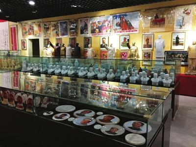 漫步“东方红展览馆”,好像行走在一条时光隧道。那变幻多姿的红色藏品讲述着一段难忘的故事。毛主席铜像、瓷像、石膏像、纪念章、照片、语录,以及刻印有毛主席语录的瓷杯、宣传画等,陈列整齐地在展馆内呈现。据介绍,展馆共收藏各类材质毛主席像章5万余枚,不同高度、大小的塑像500余尊,上世纪五六十年代的瓷器、水银镜三四百件。