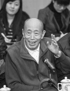 表演艺术家朱旭发表参加《甲子园》演出的感想(2013年3月25日摄)。北京人民艺术剧院证实,著名表演艺术家朱旭因病医治无效,15日2时20分在北京逝世,享年88岁。新华社发