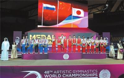 10月29日,中国队(中)、俄罗斯队(左)和日本队在颁奖台上合影。 当日,在多哈进行的第48届体操世锦赛男子团体决赛中,由肖若腾、邹敬园、邓书弟、孙炜和林超攀组成的中国队以256.634分的成绩夺得冠军,获得东京奥运会参赛资格。俄罗斯队以256.585分位居第二,日本队以253.744分获得第三。 新华社发