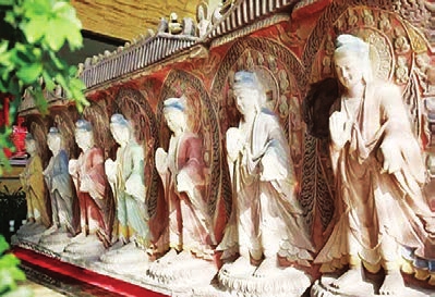 武林馆区一楼大厅3D打印成原样模型的大同云冈石窟第13窟过去七佛立像长9米、高3米,是一组北魏平城迁洛前深受南方佛教艺术影响的作品。由云冈石窟研究院监制,美科图像(深圳)有限公司制作。这件可移动展示的大型文物原比例复制品,开创了不可移动文物异地展览的先河,解决了不可移动文物无法外展的难题,可以让更多人更方便地参观到几百年乃至上千年前的艺术魁宝。整个展品具有重量轻,结实耐用,耐潮湿,阻燃防腐防水耐磨等优点,同时耐低温耐高温,可在-40℃至100℃范围内长期使用。