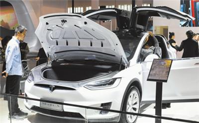 观众在海南国际会展中心举行的2019(首届)海口国际新能源汽车展览会上观看特斯拉新能源车。 新华社发