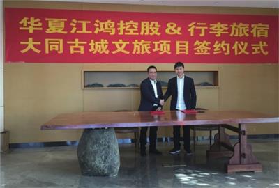 2019年1月15日下午14:00,华夏江鸿控股与行李旅宿正式签署大同古城文旅项目合作协议,华夏江鸿控股执行董事余从军与行李旅宿集团总裁赖国平出席签约仪式。双方将精诚合作,团结一致,深度挖掘大同历史文化,石窟文化,共同致力于大同文化旅游转型重构,升级发展,就文旅内容进行多维度合作。目前,已确定,行李旅宿将落地旗下新东方美学代表高端人文度假品牌—既下山,呈现丝绸之路新时光,旧灵魂,以Museum Hotel博物院酒店为主题,实施既下山计划SUNYATA LAB,包括“写作计划”和“艺术/身体计划”,尝试在旅途中,呈现如何用非消费的状态,探索自我与世界的可能。华夏江鸿控股积极响应国家政策,大同市委市政府古城复兴、旅游升级号召,历时一年考察研究,最终选择国内最具目的地影响力文旅品牌—行李旅宿作为合作方,双方合作旨在以流量、内容品牌及其号召力为引擎,赋予大同古城新生命力,打造大同文化旅游会客厅,立足大同,服务山西,成为大同城市形象新名片,华北新型旅游目的地。