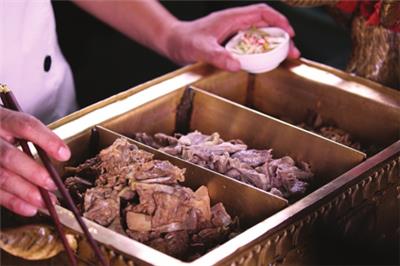 三羊开泰集羊杂、羊蝎子、手把肉于一锅,是大同美食融合特色的经典代表。大同天寒,食用羊肉暖胃滋补效果极佳,特别是大同本地山泉羊遍食中药草,肉质和药用价值更胜一筹。羊杂是大同地域名食,羊内脏有着不同于羊肉的丰富口感,加上爽滑土豆粉,汤色红亮,香味扑鼻;羊蝎子素有“补钙之王”的美誉,肉香嫩不腻,骨多髓不滑,汤浓香不膻;手把肉则是满蒙藏回等游牧民族传统食品,肉质鲜嫩,原汁原味。三味菜品入巨型羊头铜锅,寓意“三羊开泰”,大同美食粗犷之风顿现。
