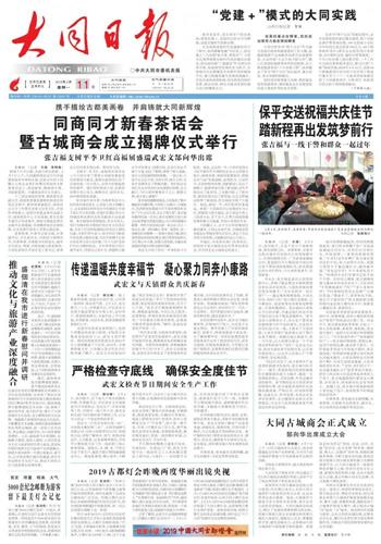 (记者 李明璇)2月7日上午,大同古城商会正式成立,商会将搭建起文化和产业的桥梁,为书写大同古城保护修复与开发新篇章作出新的贡献。