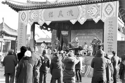 2月5日,2019古都灯会·春节文化庙会在华严寺广场开演,庙会荟萃了社火表演和文艺演出等,古城内成了民俗表演的海洋。本次文化庙会一直持续至2月20日(正月十六)。图为游客在关帝庙广场观看二人台表演。 本报记者于宏摄