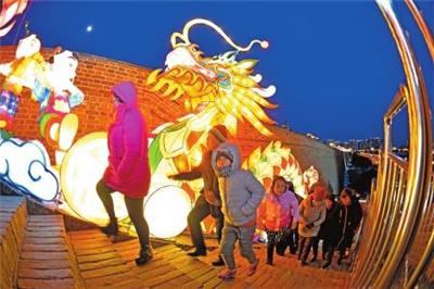 夜色中的古城墙在彩灯的映衬下分外壮观,璀璨的彩灯前人头攒动、热闹非凡。随着近日天气大幅回暖,观灯的游客大大增加。图为17日,游客来到城墙兴致勃勃地观灯。 本报记者 于宏摄