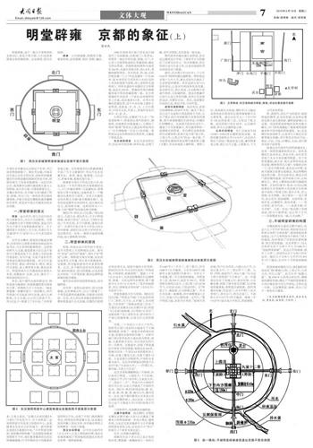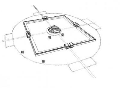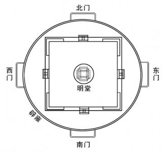 明堂的建筑方位与形制。据《汉官仪》记载:“明堂去平城门(东京洛阳南门)二里所,天子出,从平城门,先历明堂,乃至郊祀”,“辟雍去明堂三百步。”又据东汉张衡在《东京赋》中说:明堂“左(东面)制辟雍,右(西面)立灵台”。这就说明了这三者的关系,即分别为三个独立的建筑物,以及它们之间的排列。