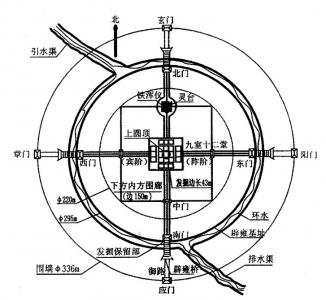 另据,二十世纪六十至七十年代,国家考古部门对洛阳古城进行了大规模的勘查,发现了一条宽23米的南北向大道,直通东京洛阳的平城门。在距平城门南2里多处的大道东面为明堂、辟雍,大道西面为灵台,并且均沿东西方向一字排列。在勘查中,发现了明堂遗址外围有方形的围墙,每条边长400米,围墙中间有一个直径63米的圆形夯土台基,台基上建有九室,台基下建有12堂。九室是按九宫格排列,中间的太室最为高大。东汉学者蔡邕在《明堂月令论》中说:“九室法九州,……四周以水,象四海,王者之大礼也”。