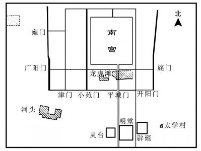 明堂辟雍的建筑方位,按《通典》的说法是“国(都城)之阳,三里之外,七里之内,丙巳之地”。此方位为“福德之地”。据1995年大同考古研究所、博物馆的剷探发掘,确定了平城明堂辟雍在大同古城东南方向五华里处,正符合这一古制。它是集明堂、辟雍、灵台三位于一体的宏大建筑。