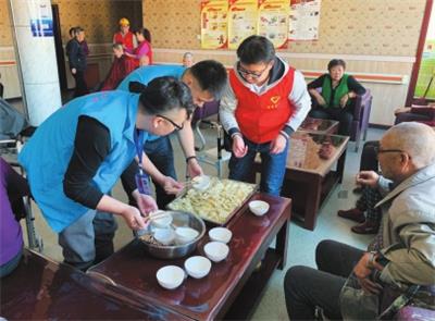 3月5日是“学雷锋纪念日”,当日上午,同煤总医院团委组织青年志愿者来到云冈区口泉老年公寓,为老人们理发、包饺子,送上慰问品,并为老年公寓的医务和护工人员免费培训日常急救技能,以实际行动弘扬雷锋精神。图为志愿者为老人包饺子。 本报记者戎禹仁摄
