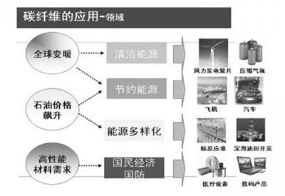 从领域的角度来讲,随着全球变暖,要用到清洁能源,并设法节约能源,石油价格飙升希望能源多样化,经济对高性能的材料提出了应用需求。以往,碳纤维往往用于国防,现在开始从国防转到民用,应用于清洁能源,如风力发电翼片(用量非常大)、压缩气瓶(储氢气瓶是国际上的难点,也是我们国家在公关的重点);节约能源,如飞机(波音787)、汽车;能源多样化,如核反应堆、深海油田开采;国民经济国防,如医疗设备、数码产品。