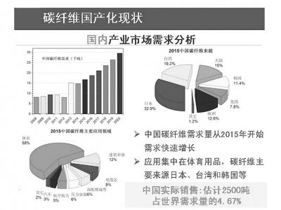 目前,我国低成本/高端碳纤维没有,低端碳纤维产能过剩;工程树脂牌号少、配套难;碳纤维复合材料自主设计应用能力较弱;碳纤维复合材料构件制造水平落后;缺乏碳纤维复合材料数据库体系和独立的可靠的性能检测和评估机构,碳纤维国产化任重道远。