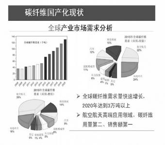 从全球产业市场需求来看,碳纤维需求量快速增长,2020年达到3万吨以上。主要用在航空航天领域和工业领域,航空航天高端应用领域用量第二、销售额第一,利润较大,工业领域用量较大。从国内产业市场需求来看,我国碳纤维需求量从2015年开始需求快速增长,应用集中在体育用品,碳纤维主要来源日本、台湾和韩国等,国产碳纤维实际销售估计2500吨,仅占世界需求量的4.67%。国内市场需求较小,产品稳定性不如国外,所以国家要加大在碳纤维上的研制力度,争取碳纤维用量不断提高。碳纤维是关系国家安全和国民经济的战略材料。本世纪初日美严格禁运严重威胁国防安全:没有T300导致已有型号难以为继,没有T800致使新一代型号难以萌生。