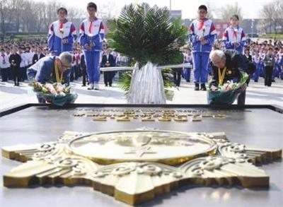 4月4日,在北京中国人民抗日战争纪念馆,老战士代表与少先队员向抗战英烈献花。当日,“清明节的铭记——尊崇英雄烈士 厚植家国情怀”主题教育系列活动启动仪式在北京中国人民抗日战争纪念馆举行。活动内容包括主题团(队)活动、清明寄语墙、抗战主题音乐会、网上祭奠、志愿者专题讲解等。新华社发