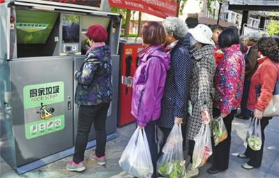 图为东城区新怡家园社区的居民排队体验智能垃圾分类箱。