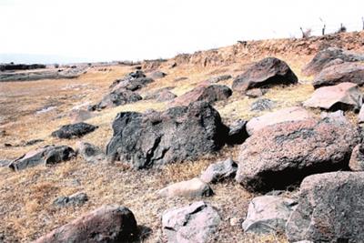 巨石?眼前的黑石似乎不够“巨”,多数半人高,宽窄不一。那文中所说与眼前所见是一回事吗?地理位置相同,但石块大小差异太多,怎么回事呢?依文中解释,巨石们在上世纪六七十年代因被碎修渠了,只剩下些体型小的石头留在原地。估计今天所见即是当年小石。