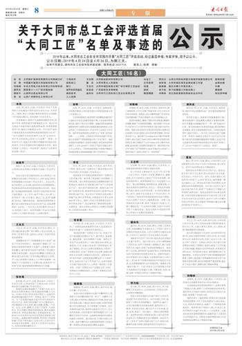 2018年以来,大同市总工会在全市范围内开展“大同工匠”评选活动,经过基层申报、专家评审,现予以公示。公示日期:2019年4月24日至4月26日,为期三天。