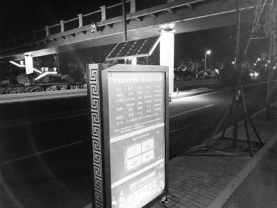 太阳能广告灯箱在我市亮相,太阳能供电系统白天进行电能转换及储备,夜晚箱体发光,不仅节电、绿色环保,而且起到广告媒介和美化古城环境的作用。图为御河东路太阳能广告灯箱夜间亮灯情景。