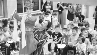 7月5日,在广灵县壶泉二中心幼儿园,孩子们触摸木偶,感受省级非物质文化遗产的独特魅力。当日,广灵县文化馆组织广灵县加斗乡八角地村木偶戏剧团演员来到壶泉二中心幼儿园,为孩子们表演省级非遗广灵木偶戏和展示木偶操作方法,让孩子们近距离感受传统艺术的魅力。图为广灵县八角地木偶戏剧团演员为孩子们展示木偶操作方法。 霍飞飞摄