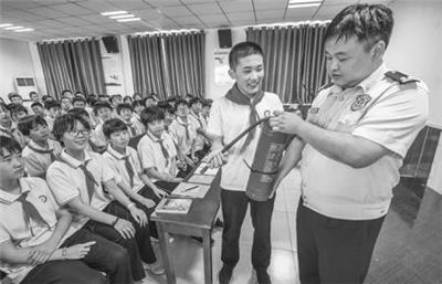 7月5日,景县消防大队消防员向景县中学学生讲解灭火器原理。