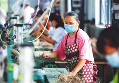 7月15日,在广西柳州市融安县融嘉工艺有限公司扶贫车间,工人在生产线上作业。 近年来,广东湛江市遂溪县和广西柳州市融安县结成帮扶对子,遂溪县把技术和资金优势送到融安县,通过开设粤桂扶贫车间,利用融安县当地丰富的竹木资源和劳动力优势,生产竹、木、藤质的篱笆。仅此一项可实现年产值1.2亿元,吸收和安排300名贫困户就业。据统计,自粤桂扶贫协作以来,广东遂溪县为广西融安县实施项目34个,通过招商引资引进两家粤企在融安落地,共建粤桂扶贫产业园1个,引导5家企业入驻。 新华社发
