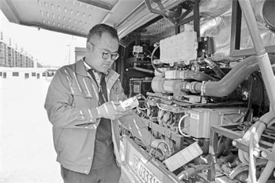 为确保氢燃料公交车安全平稳运行,方便大众出行,大同氢雄云鼎氢能科技有限公司在公交一公司设立检测点,对每一辆运营的氢能源公交车进行日常检测。图为技术人员对氢能源公交车进行日常检查 。 本报记者 于宏摄