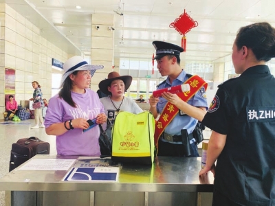 在全力做好二青会安保工作的同时,大同铁路公安处成立铁警志愿服务队,在大同站开展便民爱民服务,期间共为旅客提供服务105次,找回遗失物品12件,向旅客宣传铁路安全乘车知识、消防安全知识56次。 张海超摄