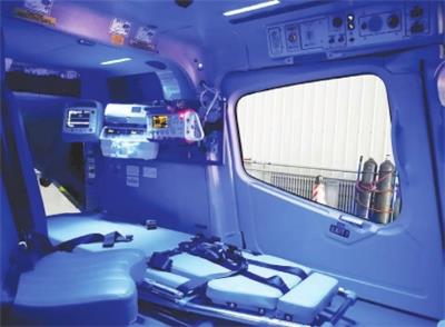“这是一架专业医疗机构型救援直升机,机舱内部犹如小型ICU,能够在救援飞行途中对患者进行及时抢救,最大限度挽救患者生命。”站在威风凛凛的橘色AW119前,金汇通航公司工作人员向记者介绍说,这架直升机长约13米,重约2.8吨,最大时速可达到每小时270公里,荷载5人,包括2名飞行员、2名医护人员、1名病人。机上配有呼吸机、电除颤、注射泵、吸引器、脊柱板、高压氧气瓶等急救所需的专业医疗设备,且经过适航认证。“救援直升机最快可在15分钟到30分钟内起飞升空,只需机身1.5倍大的场地即可降落。在‘净空’环境下,场地直径20至30米即可满足AW119降落要求。”