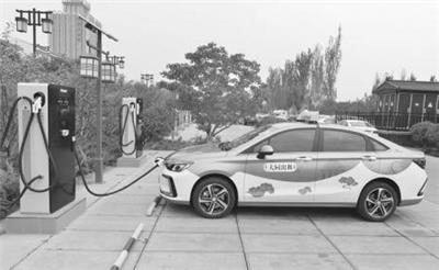 为了方便电动汽车及时充电,大同平城新能源科技有限公司在东城墙带状公园和西城墙带状公园的停车场内,建设完成了4座智能充电站,这4座智能充电站共安装55个充电桩,可同时满足110辆电动车的充电需求。图为新能源电动出租车正在充电站内充电。 本报记者 戎禹仁摄