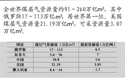 ,世界主要产煤国都十分重视开发煤层气。其中俄罗斯17~113万亿m3,居世界第一位。第二位是加拿大,我国位居世界第三,美国位居第四,澳大利亚位居第五。美国煤层气资源量21.19万亿m3,可采资源量3.07万亿m3