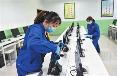 4 月 20日,在山西省太原市杏花岭区第一中学,工作人员在机房内打扫卫生。 近日,山西省太原市各中学按照疫情防控工作的部署,精心准备迎接开学复课。根据山西省教育厅下发的通知,山西省初三年级将于4月25日开学。 新华社发