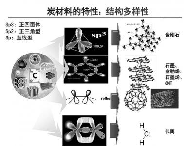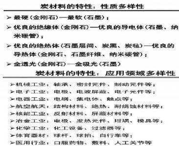 炭材料有金属和陶瓷的性能,能起到单一的金属或者陶瓷起不到的作用。炭材料具有结构多样性、聚集形态多样性、性质多样性、应用领域多样性等一系列特性。其中炭材料包含有最硬的金刚石,也有最软的石墨;包含优良的绝缘体金刚石,优良的导电体石墨、纳米碳管等;包含优良的绝热体石墨层间、炭黑、炭毡和优良的导热体金刚石、石墨纤维、纳米碳管;包含全透光的金刚石,全吸光的石墨。