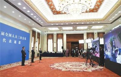 5月25日,第十三届全国人民代表大会第三次会议举行第二场“代表通道”采访活动。这是全国人大代表通过网络视频方式接受采访。