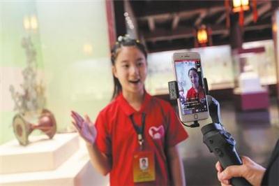 6月1日,小志愿者于冰清在沈阳故宫博物馆内通过直播向观众讲解“古趣童心——清宫文物中的儿童世界”展览。