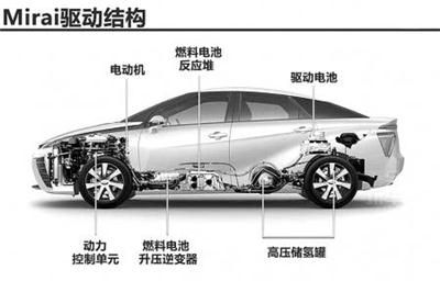 2014年12月15日,丰田汽车在日本发布全球第一款量产氢燃料电池汽车Mirai,其以氢气为动力源,产生电能通过电动机来驱动车辆。Mirai的售价为723.6万日元(约44万人民币),经政府补贴后,实际的售价在520万日元左右(约31万人民币),极大地降低了燃料电池汽车的价格。丰田自1992年开始研究氢燃料电池汽车,共造出五代FCHV车型。经过了20年的技术积累,丰田终于在2013年东京车展上推出了最大续驶里程约550km的FCV概念车。储氢罐中的氢气与车头吸入的氧气在燃料电池内发生反应,产生的电能驱动电机从而带动车辆;反应产生的剩余电能存入动力电池内。Mirai的输出功率以及最高时速和百公里加速与当前市售的家用轿车相差无几。由于没有内燃机,Mirai在行驶过程中只有胎噪,相比传统汽车更为安静,且排放物只有水,无污染。