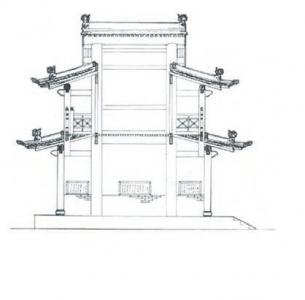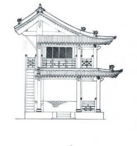 梳妆楼装修皆置于四根通柱间,上下两层前檐明间设五抹头隔扇门,各为四扇,上层山面同。整个隔扇门用材较小。