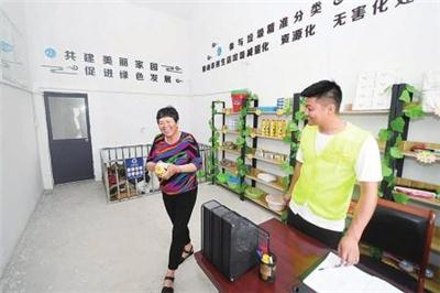 5月起,浙江省湖州市南浔区菱湖镇杨港村生活垃圾智慧平台启用,平台记录211户村民每天易腐垃圾的总量以及每户垃圾分类情况,村民通过参与垃圾分类获得积分奖励,智慧平台的使用推动了乡村垃圾分类工作。图为6月10日,南浔区菱湖镇杨港村村民(左)使用垃圾分类奖励积分兑换日用品。 新华社记者 黄宗治摄