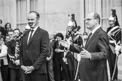 7月3日,在法国巴黎总理府,卸任总理爱德华·菲利普(前左)与新任总理让·卡斯泰(前右)出席权力交接仪式。