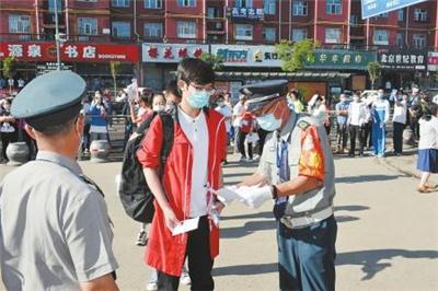 昨日,备受瞩目的2020年高考拉开帷幕。图为考务人员正在对考生进行身份信息查验。 本报记者 戎禹仁摄