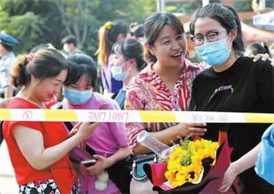 7月8日,全国部分地区2020年高考结束。图为陕西省西安中学考点,家长为考生送上鲜花。 新华社记者 刘潇摄