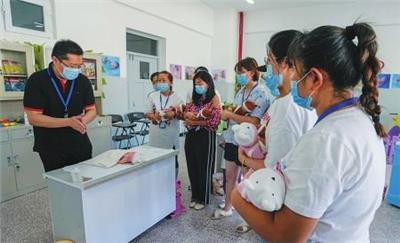 7月9日,在乌鲁木齐市沙依巴克区市民进修学校实用技能培训中心,老师余诗坤(左一)向学员教授育婴技能。乌鲁木齐市沙依巴克区市民进修学校实用技能培训中心自5月下旬开班以来,针对有市场需求的美容美发、中西式面点、电工、养老育婴、电子商务等8种岗位,面向失业人员提供“家门口培训”,帮助他们掌握一技之长。新华社记者 赵戈摄