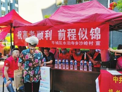 平城区水泊寺乡辖区内有大同二中、北师大大同附中两个高考考点。连日来,乡党委号召全乡考点附近的党组织积极开展高考助考公益活动,动员广大党员、入党积极分子及爱心人士投入到助考活动中。水泊寺村党支部、曹夫楼村党支部和沙岭村党支部也都积极响应乡党委号召,分别组织了丰富多彩的爱心助考活动,全力为高考保驾护航。