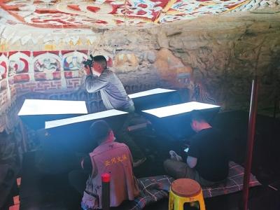 工作人员正在石窟内进行数字采集工作。 本报记者 张占兵摄