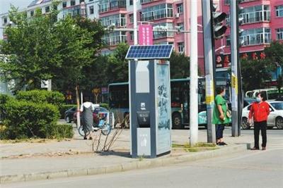 云冈区在五一街、和瑞街、平德路、平喜路、平安大道等主干道安装的新型太阳能环保垃圾箱兼具灯光照明和垃圾分类收集功能,白天位于箱体顶端的太阳能光伏板吸收太阳能,晚上利用太阳能发电,箱体通体明亮,点亮城市夜景。图为云冈区平安大道上安放的新型太阳能环保垃圾箱。 本报记者 戎禹仁摄