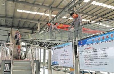 图为山西上捷电梯有限公司工作人员正在组装、检测自动行人电梯。