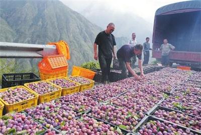 图为9月6日,理县桃坪镇佳山村村民在转运刚采摘的青红脆李。 新华社记者 梁志强摄