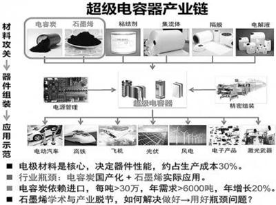 基于多孔电极材料的超级电容器具备快速的离子传输性能,高的功率密度,长的循环稳定性进而用于高效储能。超级电容器的产业链涉及材料攻关、器件组装和应用示范等方面。其中,电极材料是核心,决定器件性能,约占生产成本30%。目前存在的行业瓶颈是电容炭国产化有待提高以及石墨烯实际应用有待加强。当前,电容炭严重依赖进口,每年需求大于6000吨,且每年以20%的速度增长。
