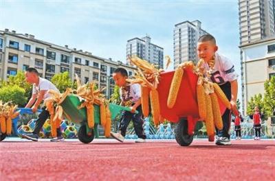 9 月 21日,山东省烟台市福山区清洋街道中心幼儿园的小朋友进行“运送粮食”趣味比赛。 9月22日是第三个中国农民丰收节,多地举办形式多样的活动迎接丰收节。 新华社发孙文潭摄