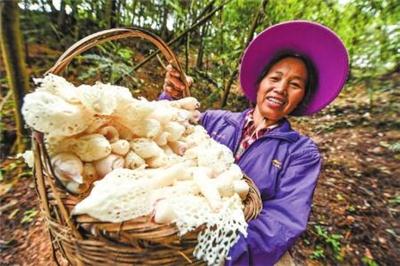 在贵州省榕江县寨蒿镇高赧村原始森林竹荪基地,村民在展示刚采摘的竹荪(9月18日摄)。 近年来,贵州省黔东南苗族侗族自治州榕江县依托当地丰富的林地资源,因地制宜大力发展“林下经济”,引导农民发展林下食用菌、林下中药材、林下养鸡、林下养蜂等产业,推进产业扶贫,带动农民实现“林下增收”。 新华社记者 杨文斌摄